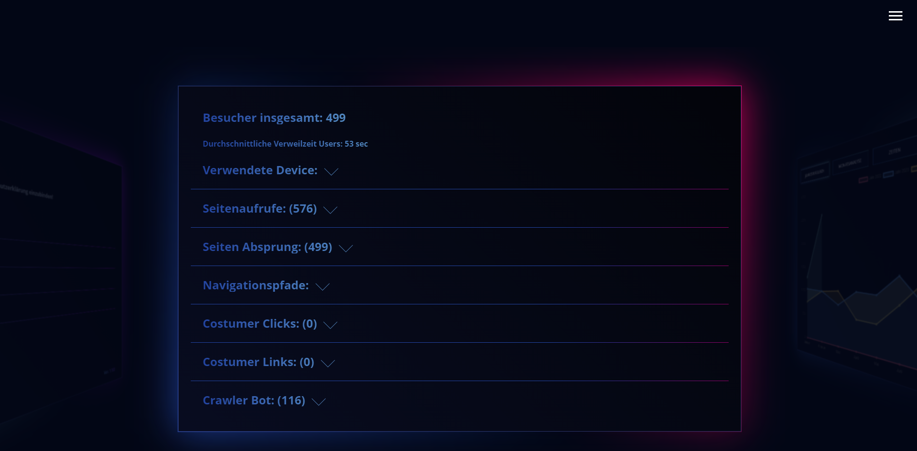 Analytics-Analyzer Arno erfasst das Besucherverhalten auf Webseiten präzise – inklusive Seitenaufrufen, Geräten, Browsern, Verweildauer und Bot-Erkennung, komplett ohne Cookies oder Drittanbieter.
